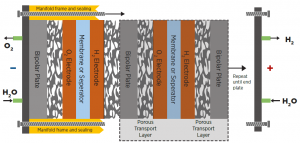 - The cell is the core of the electrolyzer and it is where the electrochemical process takes place. It is composed of the two electrodes – Anode and Cathode, immersed in a liquid electrolyte or adjacent to a solid electrolyte membrane, two porous transport layers to facilitate the transport of reactants and removal of products and the bipolar plates which provide mechanical support and distribute the flow.